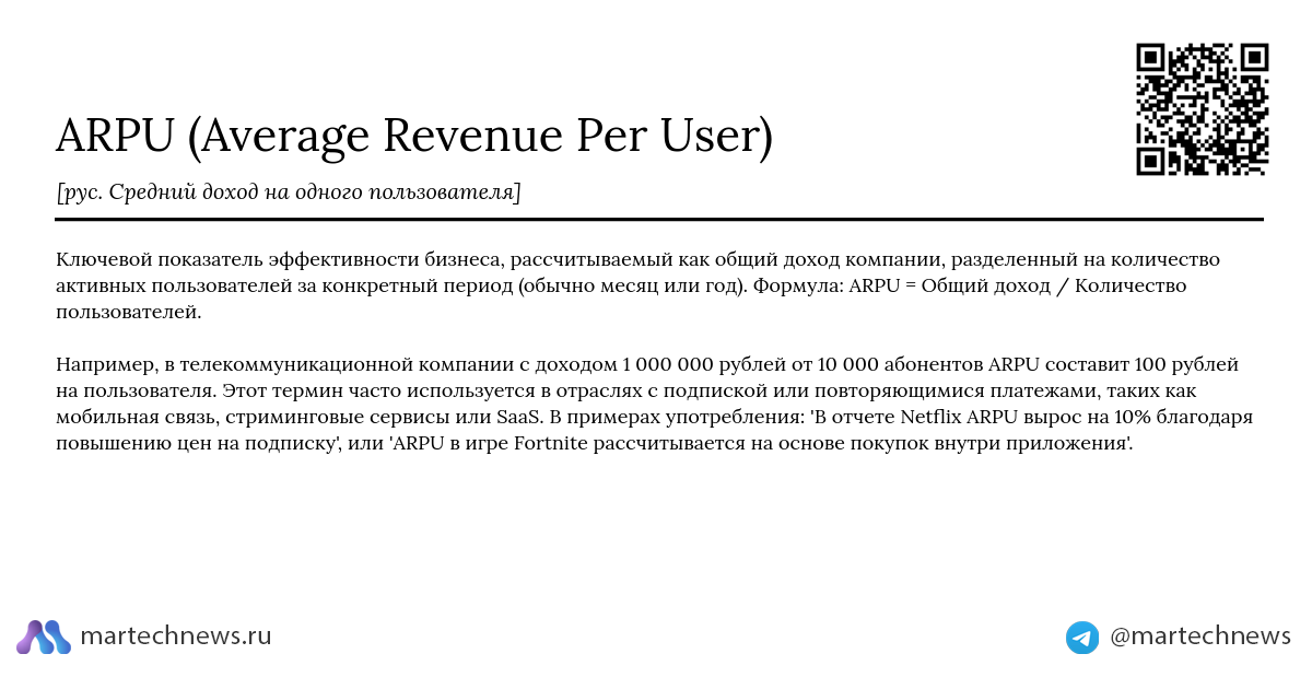 Ключевой показатель эффективности бизнеса, рассчитываемый как общий доход компании, разделенный на количество активных пользователей за конкретный период (обычно месяц или год). Формула: ARPU = Общий доход / Количество пользователей.