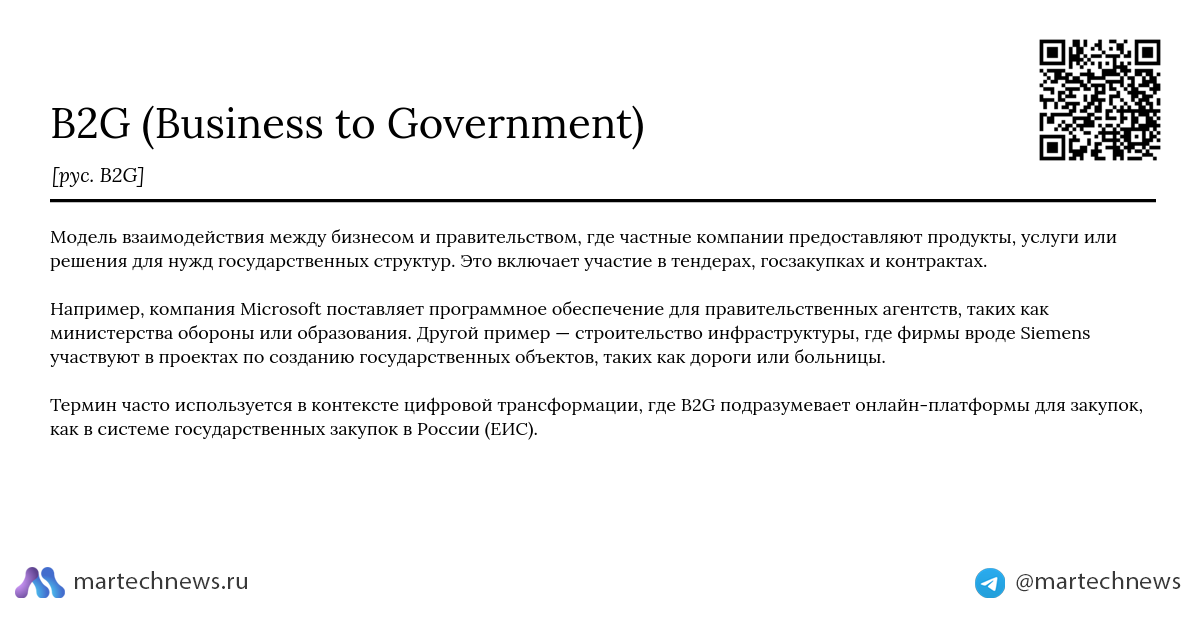 Термин часто используется в контексте цифровой трансформации, где B2G подразумевает онлайн-платформы для закупок, как в системе государственных закупок в России (ЕИС).