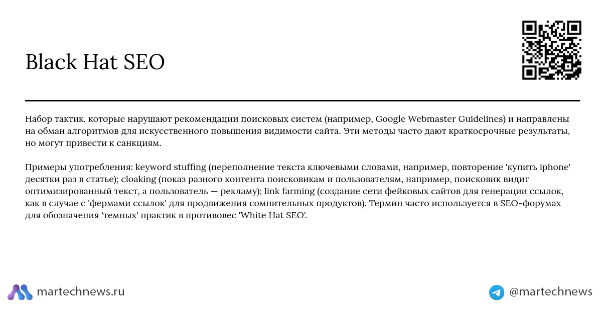 Набор тактик, которые нарушают рекомендации поисковых систем (например, Google Webmaster Guidelines) и направлены на обман алгоритмов для искусственного повышения видимости сайта. Эти методы часто дают краткосрочные результаты, но могут привести к санкциям.