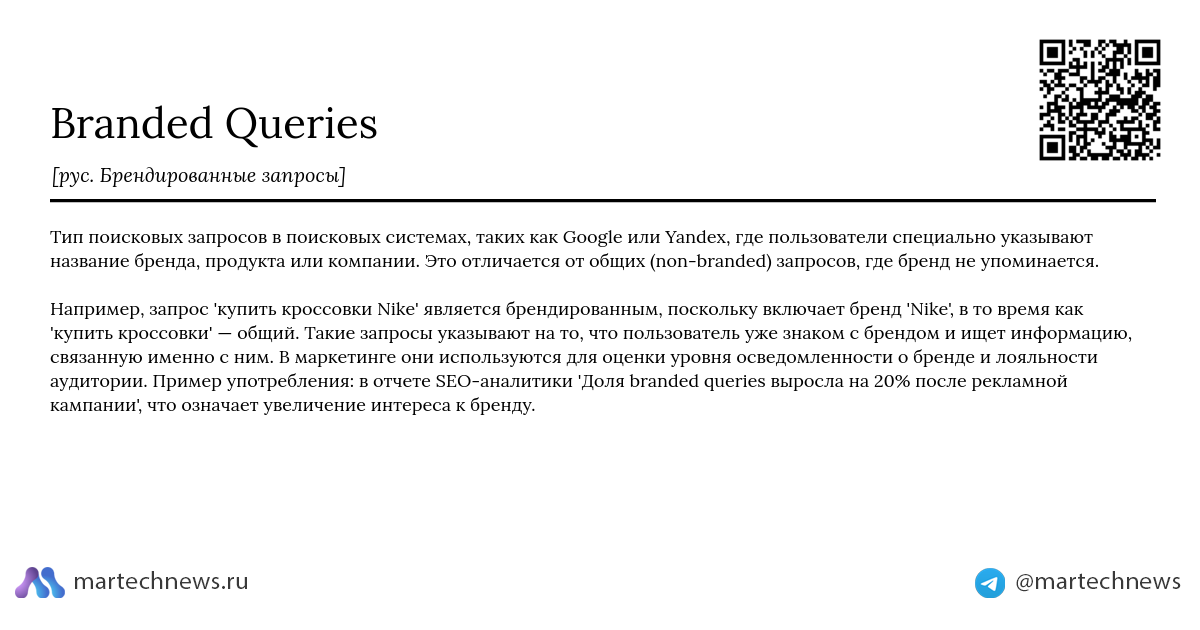 Например, запрос 'купить кроссовки Nike' является брендированным, поскольку включает бренд 'Nike', в то время как 'купить кроссовки' — общий. Такие запросы указывают на то, что пользователь уже знаком с брендом и ищет информацию, связанную именно с ним. В маркетинге они используются для оценки уровня осведомленности о бренде и лояльности аудитории. Пример употребления: в отчете SEO-аналитики 'Доля branded queries выросла на 20% после рекламной кампании', что означает увеличение интереса к бренду.