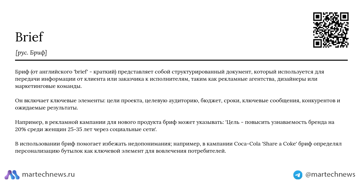 Бриф (от английского 'brief' - краткий) представляет собой структурированный документ, который используется для передачи информации от клиента или заказчика к исполнителям, таким как рекламные агентства, дизайнеры или маркетинговые команды.