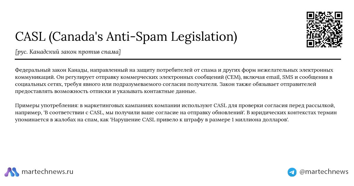 Федеральный закон Канады, направленный на защиту потребителей от спама и других форм нежелательных электронных коммуникаций. Он регулирует отправку коммерческих электронных сообщений (CEM), включая email, SMS и сообщения в социальных сетях, требуя явного или подразумеваемого согласия получателя. Закон также обязывает отправителей предоставлять возможность отписки и указывать контактные данные.