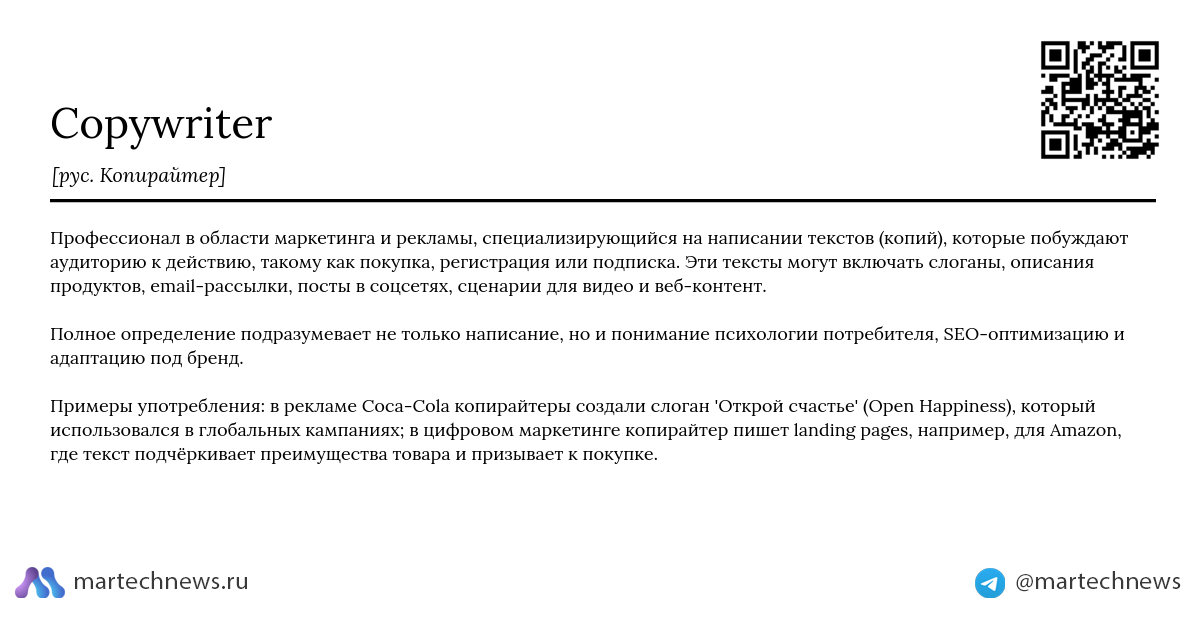 Примеры употребления: в рекламе Coca-Cola копирайтеры создали слоган 'Открой счастье' (Open Happiness), который использовался в глобальных кампаниях; в цифровом маркетинге копирайтер пишет landing pages, например, для Amazon, где текст подчёркивает преимущества товара и призывает к покупке.