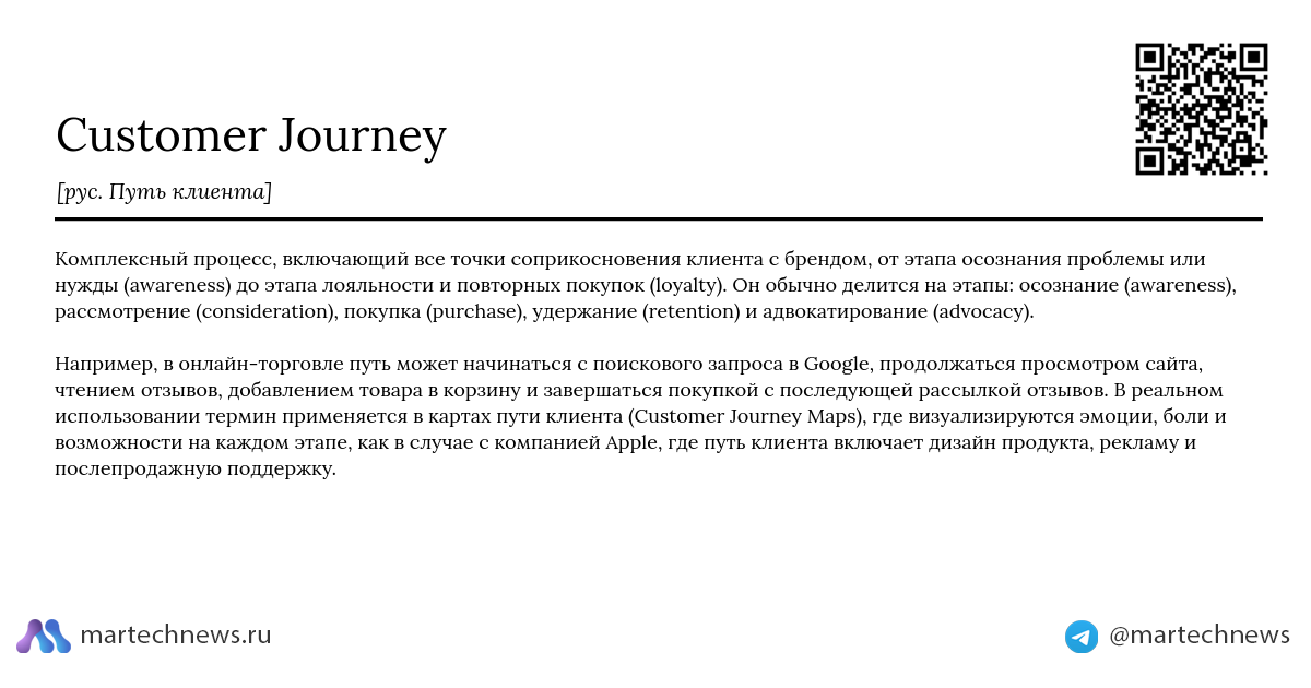 Комплексный процесс, включающий все точки соприкосновения клиента с брендом, от этапа осознания проблемы или нужды (awareness) до этапа лояльности и повторных покупок (loyalty). Он обычно делится на этапы: осознание (awareness), рассмотрение (consideration), покупка (purchase), удержание (retention) и адвокатирование (advocacy).