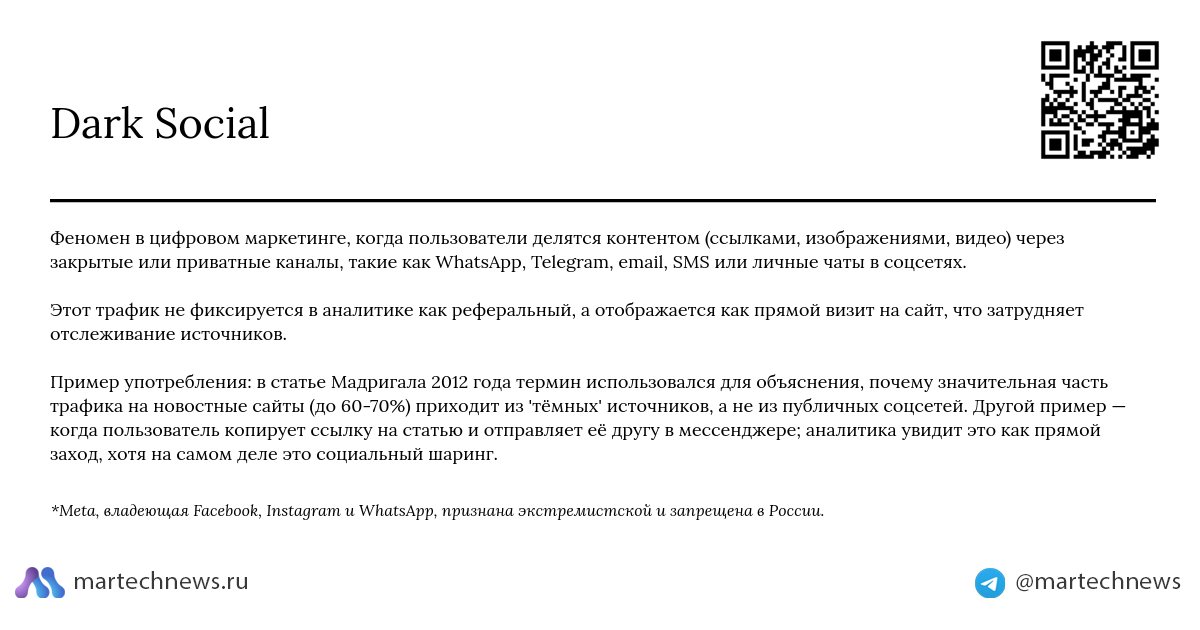 Пример употребления: в статье Мадригала 2012 года термин использовался для объяснения, почему значительная часть трафика на новостные сайты (до 60-70%) приходит из 'тёмных' источников, а не из публичных соцсетей. Другой пример — когда пользователь копирует ссылку на статью и отправляет её другу в мессенджере; аналитика увидит это как прямой заход, хотя на самом деле это социальный шаринг.