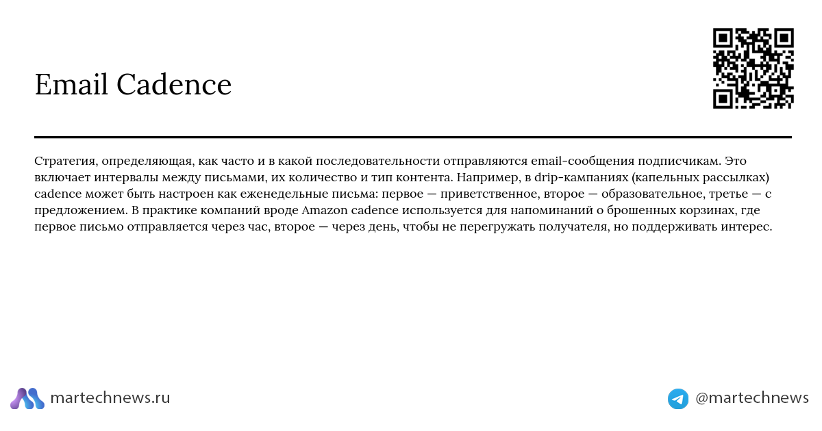 Стратегия, определяющая, как часто и в какой последовательности отправляются email-сообщения подписчикам. Это включает интервалы между письмами, их количество и тип контента. Например, в drip-кампаниях (капельных рассылках) cadence может быть настроен как еженедельные письма: первое — приветственное, второе — образовательное, третье — с предложением. В практике компаний вроде Amazon cadence используется для напоминаний о брошенных корзинах, где первое письмо отправляется через час, второе — через день, чтобы не перегружать получателя, но поддерживать интерес.