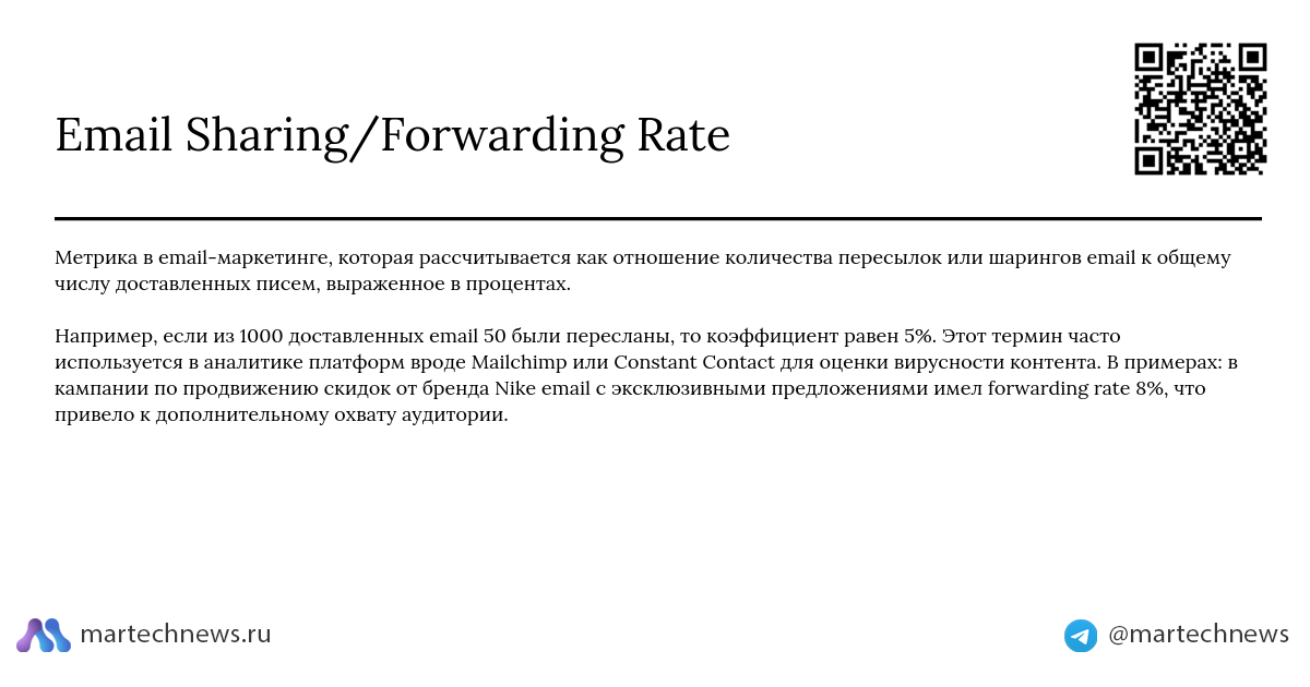 Метрика в email-маркетинге, которая рассчитывается как отношение количества пересылок или шарингов email к общему числу доставленных писем, выраженное в процентах.