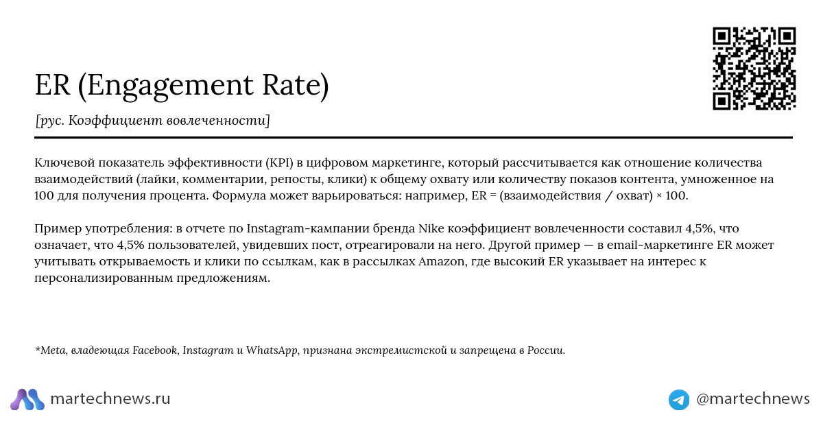 Ключевой показатель эффективности (KPI) в цифровом маркетинге, который рассчитывается как отношение количества взаимодействий (лайки, комментарии, репосты, клики) к общему охвату или количеству показов контента, умноженное на 100 для получения процента. Формула может варьироваться: например, ER = (взаимодействия / охват) × 100.