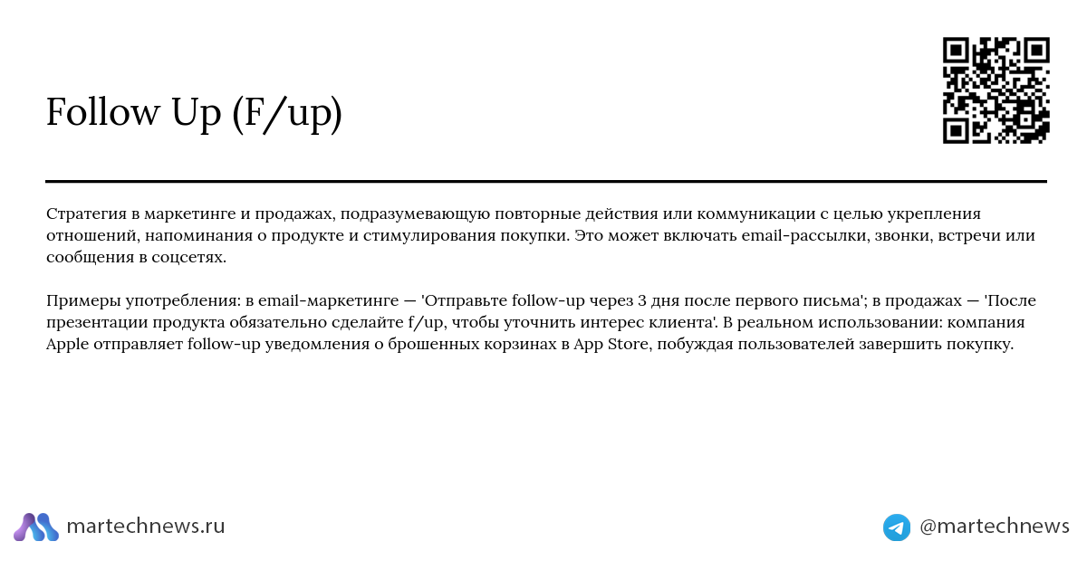 Примеры употребления: в email-маркетинге — 'Отправьте follow-up через 3 дня после первого письма'; в продажах — 'После презентации продукта обязательно сделайте f/up, чтобы уточнить интерес клиента'. В реальном использовании: компания Apple отправляет follow-up уведомления о брошенных корзинах в App Store, побуждая пользователей завершить покупку.