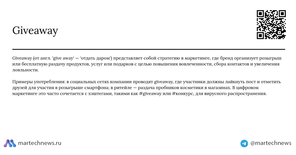 Giveaway (от англ. 'give away' — 'отдать даром') представляет собой стратегию в маркетинге, где бренд организует розыгрыш или бесплатную раздачу продуктов, услуг или подарков с целью повышения вовлеченности, сбора контактов и увеличения лояльности.