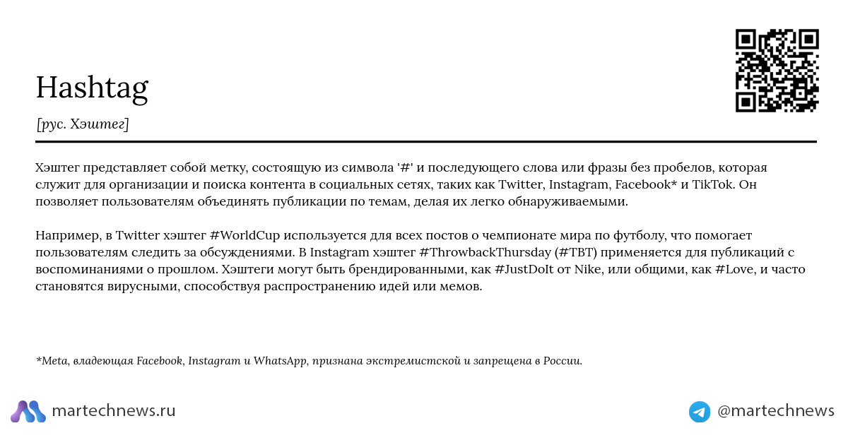 Хэштег представляет собой метку, состоящую из символа '#' и последующего слова или фразы без пробелов, которая служит для организации и поиска контента в социальных сетях, таких как Twitter, Instagram, Facebook* и TikTok. Он позволяет пользователям объединять публикации по темам, делая их легко обнаруживаемыми.