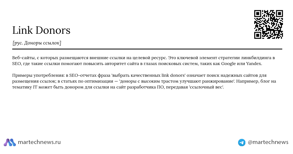 Примеры употребления: в SEO-отчетах фраза 'выбрать качественных link donors' означает поиск надежных сайтов для размещения ссылок; в статьях по оптимизации — 'доноры с высоким трастом улучшают ранжирование'. Например, блог на тематику IT может быть донором для ссылки на сайт разработчика ПО, передавая 'ссылочный вес'.
