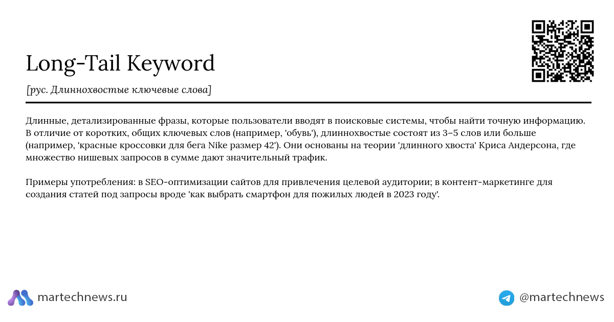Длинные, детализированные фразы, которые пользователи вводят в поисковые системы, чтобы найти точную информацию. В отличие от коротких, общих ключевых слов (например, 'обувь'), длиннохвостые состоят из 3–5 слов или больше (например, 'красные кроссовки для бега Nike размер 42'). Они основаны на теории 'длинного хвоста' Криса Андерсона, где множество нишевых запросов в сумме дают значительный трафик.