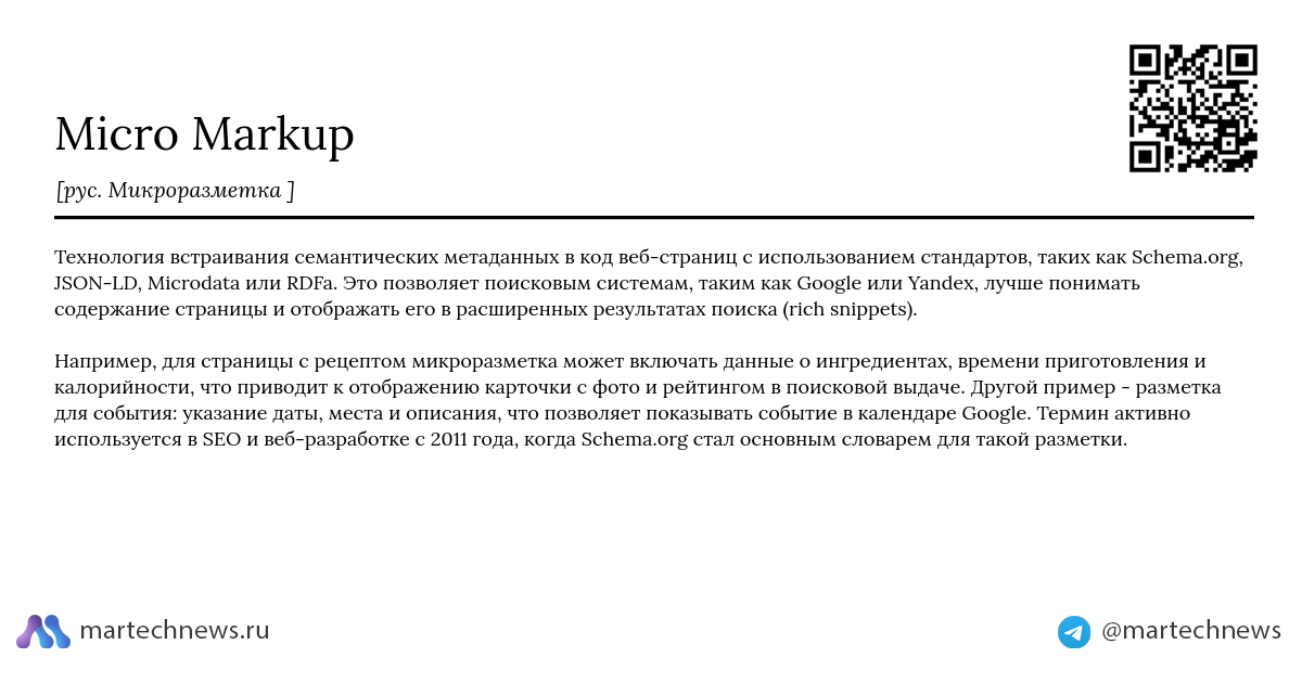 Например, для страницы с рецептом микроразметка может включать данные о ингредиентах, времени приготовления и калорийности, что приводит к отображению карточки с фото и рейтингом в поисковой выдаче. Другой пример - разметка для события: указание даты, места и описания, что позволяет показывать событие в календаре Google. Термин активно используется в SEO и веб-разработке с 2011 года, когда Schema.org стал основным словарем для такой разметки.