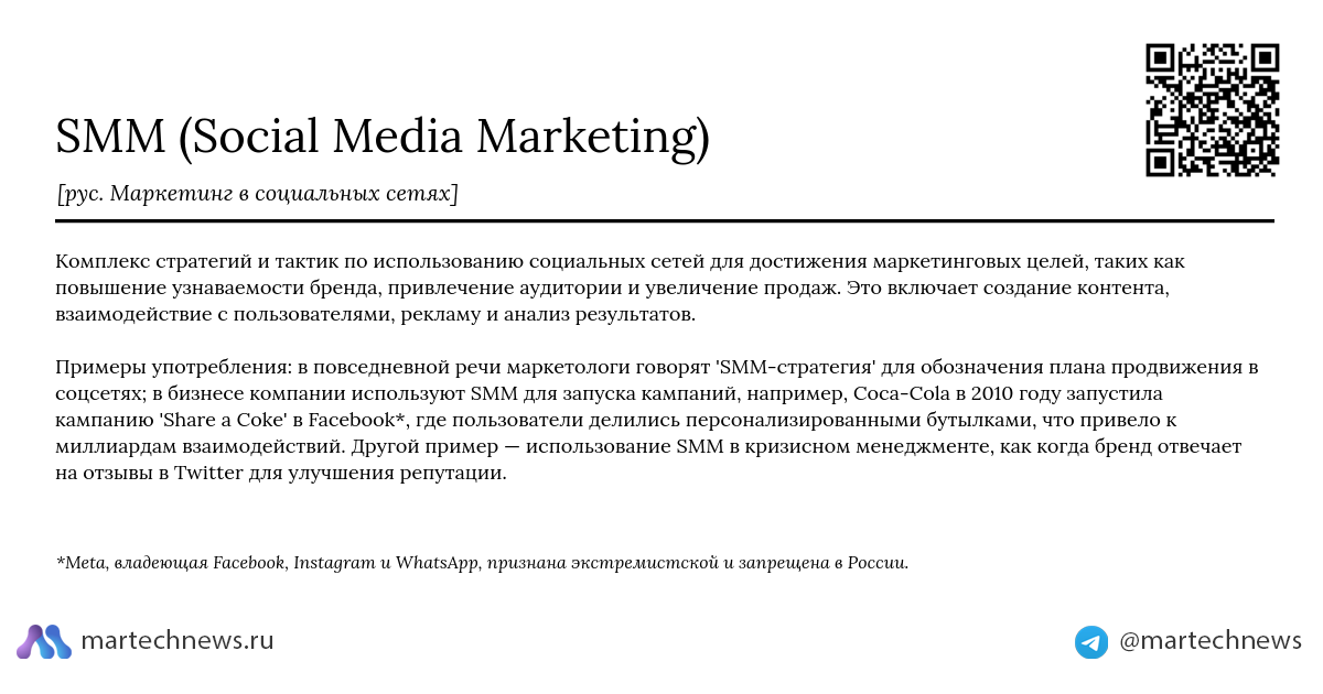 Примеры употребления: в повседневной речи маркетологи говорят 'SMM-стратегия' для обозначения плана продвижения в соцсетях; в бизнесе компании используют SMM для запуска кампаний, например, Coca-Cola в 2010 году запустила кампанию 'Share a Coke' в Facebook*, где пользователи делились персонализированными бутылками, что привело к миллиардам взаимодействий. Другой пример — использование SMM в кризисном менеджменте, как когда бренд отвечает на отзывы в Twitter для улучшения репутации.