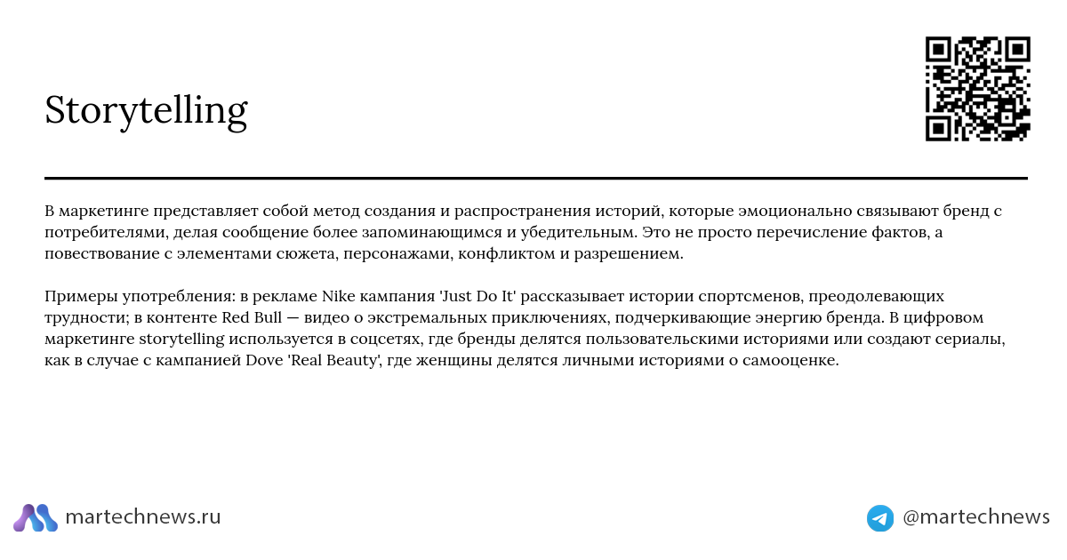 Примеры употребления: в рекламе Nike кампания 'Just Do It' рассказывает истории спортсменов, преодолевающих трудности; в контенте Red Bull — видео о экстремальных приключениях, подчеркивающие энергию бренда. В цифровом маркетинге storytelling используется в соцсетях, где бренды делятся пользовательскими историями или создают сериалы, как в случае с кампанией Dove 'Real Beauty', где женщины делятся личными историями о самооценке.