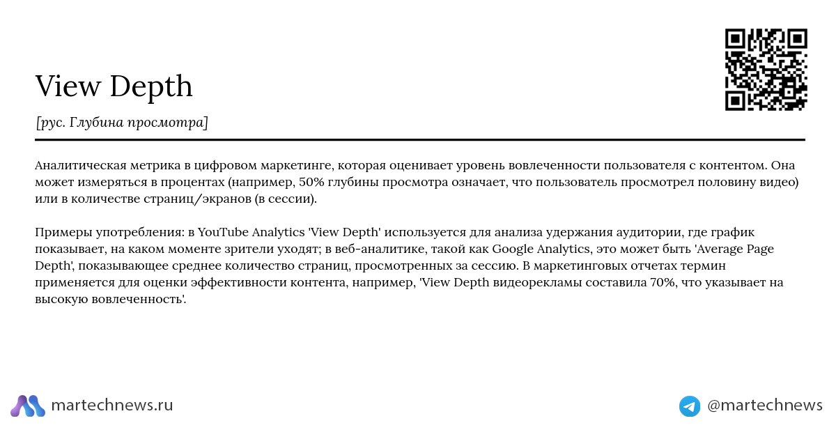 Аналитическая метрика в цифровом маркетинге, которая оценивает уровень вовлеченности пользователя с контентом. Она может измеряться в процентах (например, 50% глубины просмотра означает, что пользователь просмотрел половину видео) или в количестве страниц/экранов (в сессии).