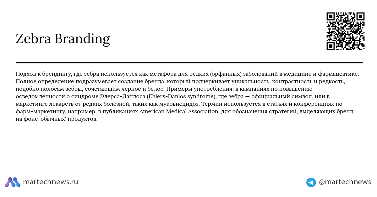 Подход к брендингу, где зебра используется как метафора для редких (орфанных) заболеваний в медицине и фармацевтике. Полное определение подразумевает создание бренда, который подчеркивает уникальность, контрастность и редкость, подобно полосам зебры, сочетающим черное и белое. Примеры употребления: в кампаниях по повышению осведомленности о синдроме Элерса-Данлоса (Ehlers-Danlos syndrome), где зебра — официальный символ, или в маркетинге лекарств от редких болезней, таких как муковисцидоз. Термин используется в статьях и конференциях по фарм-маркетингу, например, в публикациях American Medical Association, для обозначения стратегий, выделяющих бренд на фоне 'обычных' продуктов.